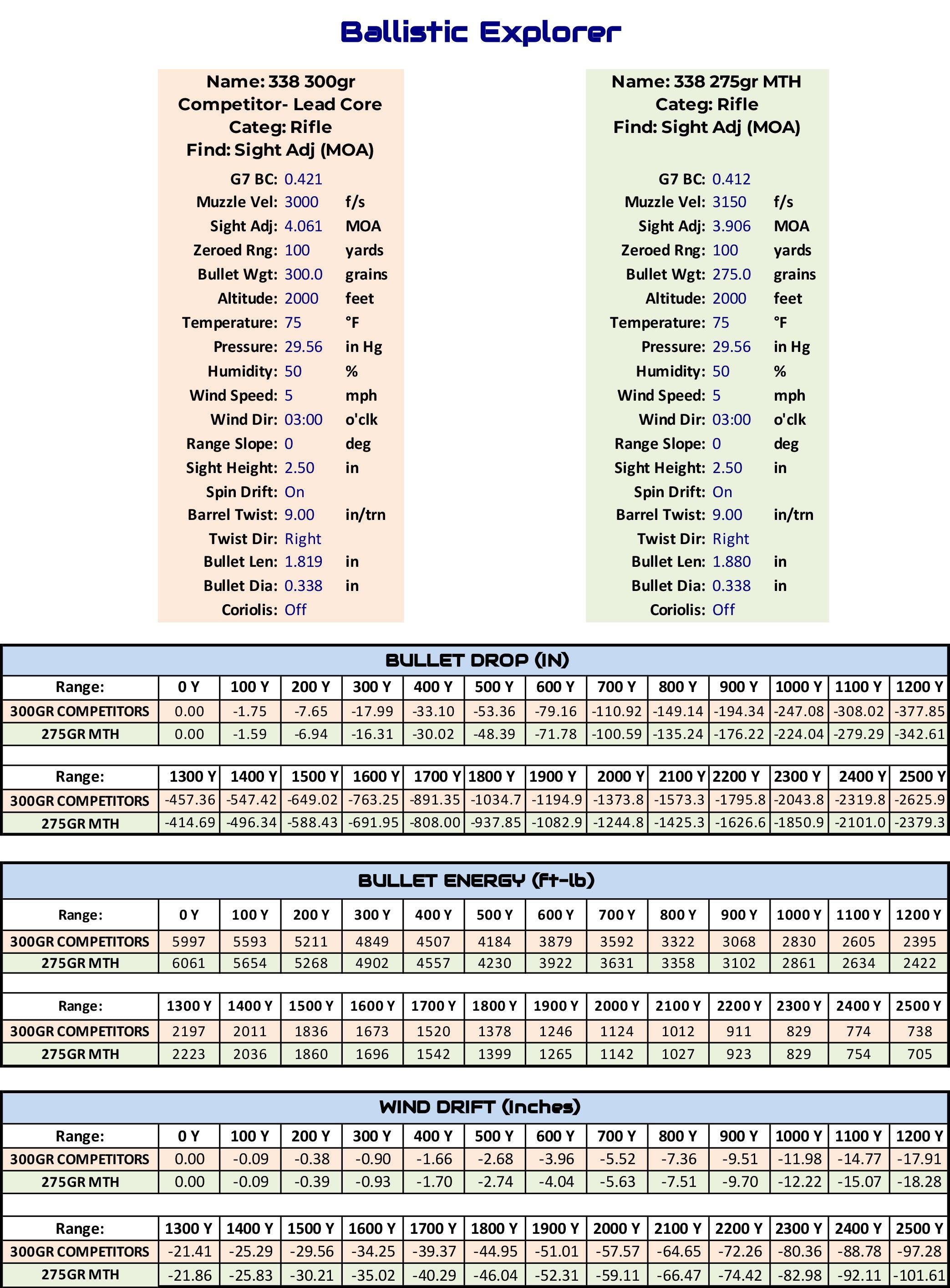 Using Solid copper bullets requires a different way of thinking than with jacketed lead core bullets. Since copper is lighter and less dense than lead, it is not practical to make very heavy bullets without making them extremely long. Very long bullets require a much faster twist barrel to stabilize them, which are not standard on factory rifles, and become unstable quicker. Thus, the use of lighter bullets requires "thinking faster" instead of heavier. A lighter bullet with a high ballistic coefficient shot at faster speeds has less drop at all ranges than heavy jacketed bullets. Energy is slightly less and wind drift is virtually the same. See graph to the right.
